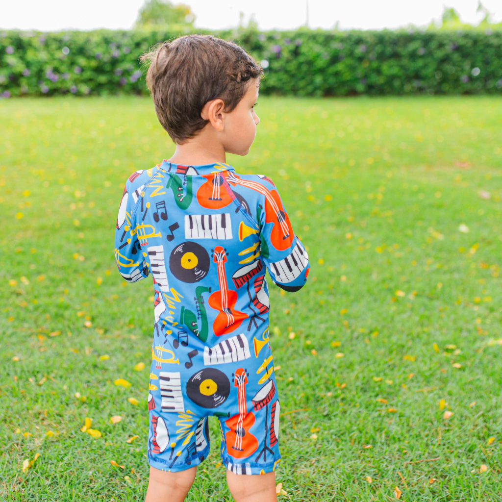 Deixe seu pequeno brilhar com o Macacão Infantil com Zíper Estampado de Instrumentos Musicais! Confeccionado em poliamida, ele apresenta uma estampa vibrante de instrumentos musicais que promete trazer a alegria da música para os dias de diversão.