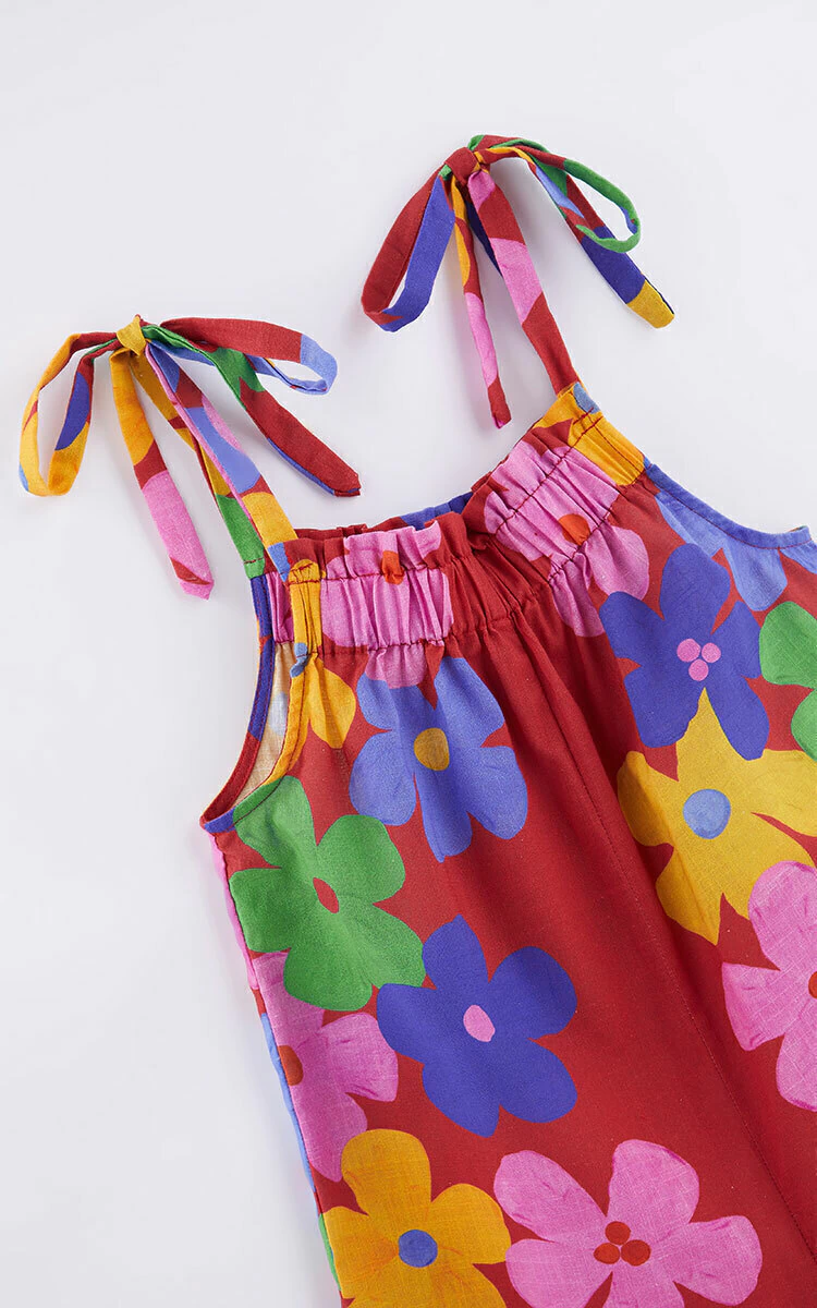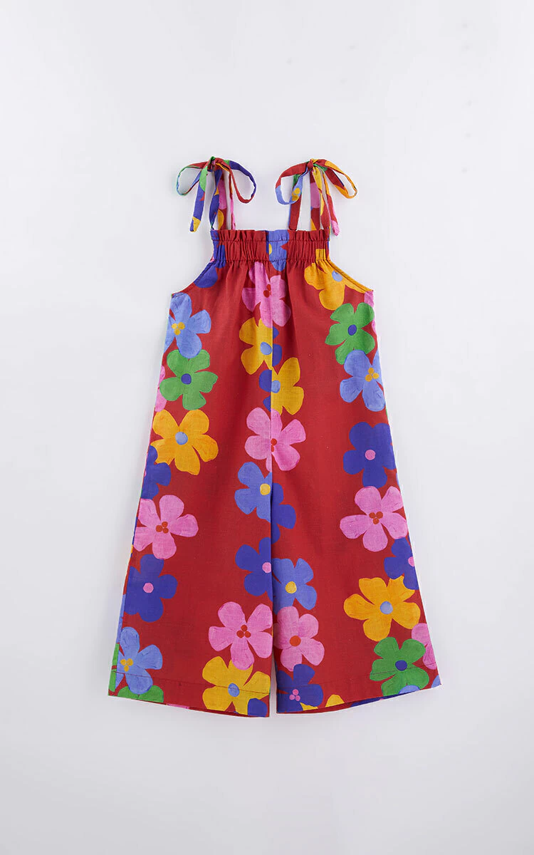 Com uma estampa vibrante de flores coloridas em fundo vermelho, este macacão é a expressão da alegria da infância. As alças ajustáveis garantem um ajuste perfeito, enquanto o detalhe franzido no decote adiciona um toque de sofisticação.
