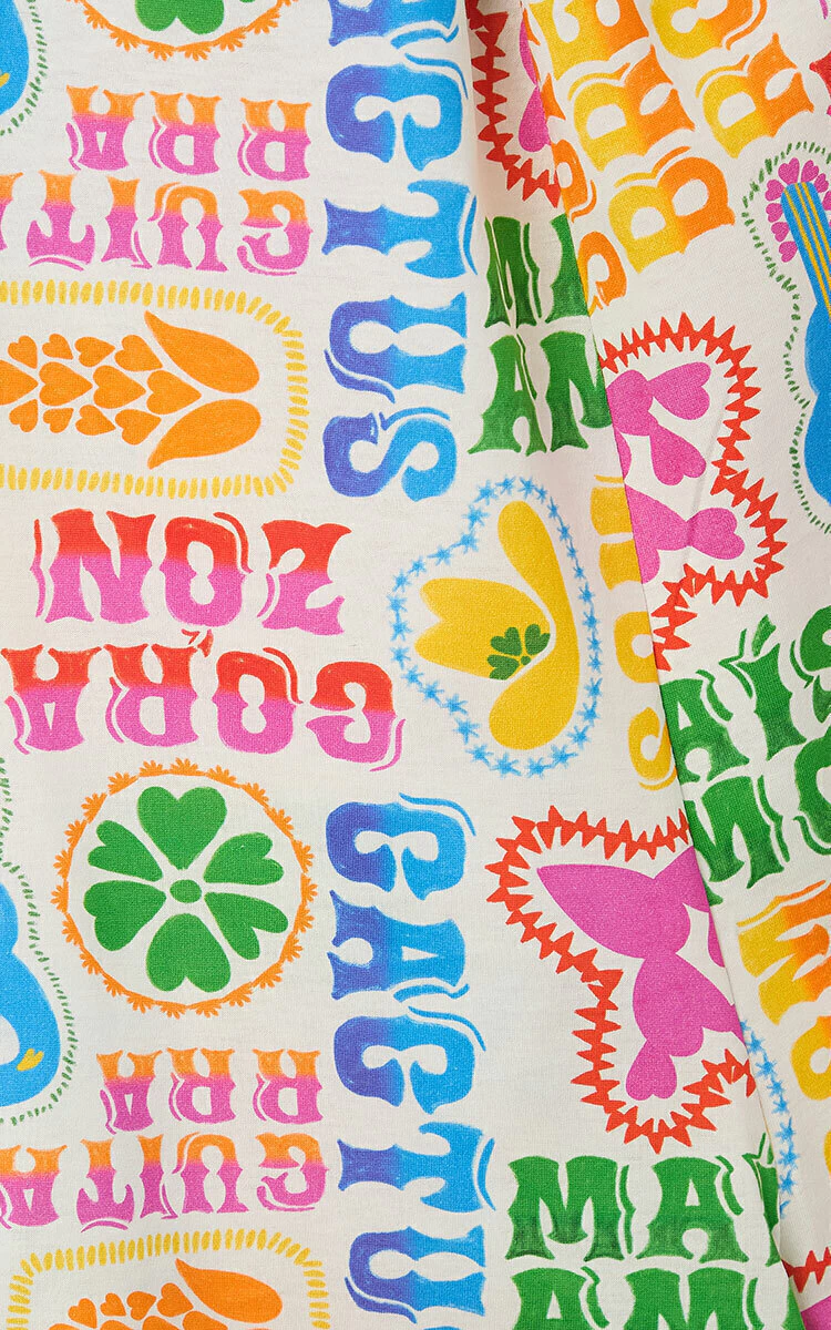 O destaque fica para a estampa exclusiva Maiz Amor, inspirada na festa junina e no folclore brasileiro, com detalhes encantadores como cactos, sanfonas, violões e palavras coloridas como AMOR e CORAÇÃO. Essa combinação transforma o macaquinho em uma peça alegre e cheia de vida, ideal para a pequena que adora se destacar.
