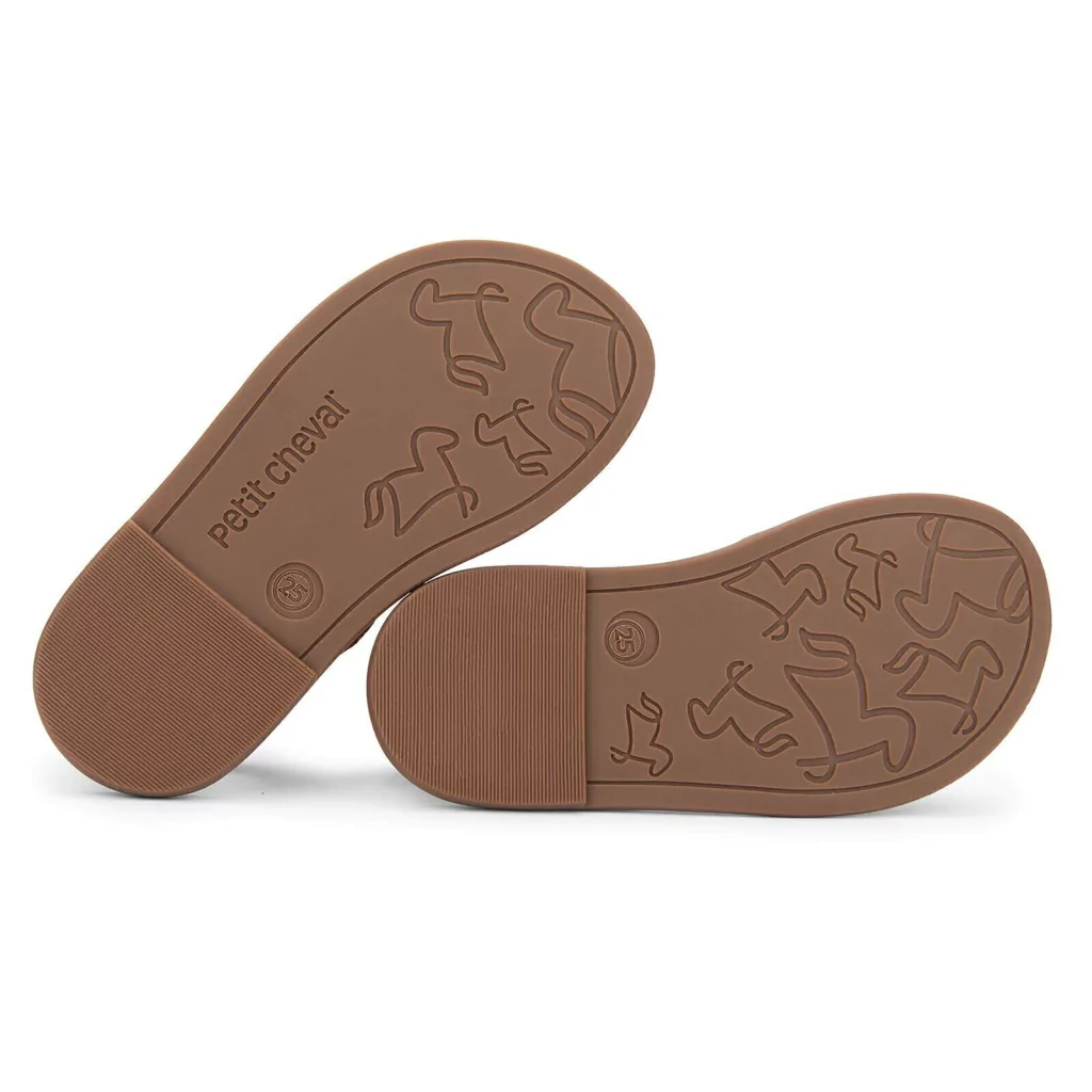 Produzida em couro macio por dentro e por fora, a sandália Balanço da Petit Cheval, apesar de ter bico fechado, absorve a transpiração e mantém os pés frescos durante todo o tempo de uso. Possui palmilha plana em couro e uma modelagem simples.