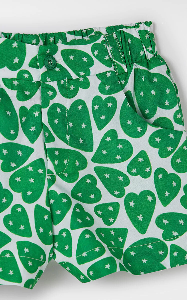 Produzido em 100% algodão, esse short infantil é supermacio e fresquinho, ideal para o calor do Brasil. Com uma estampa divertida de corações verdes e detalhes brancos, ele traz aquele charme que só as pequenas merecem.