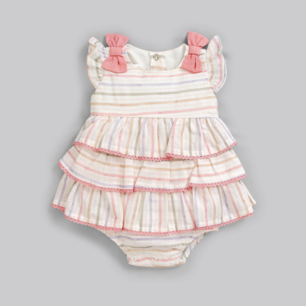 Com um design listrado encantador e fechamento por botão nas costas, o modelo é prático para vestir e garante um caimento impecável. Ideal para ocasiões casuais, ele acompanha sua bebê desde os primeiros meses, disponível nos tamanhos de 1 a 12 meses.