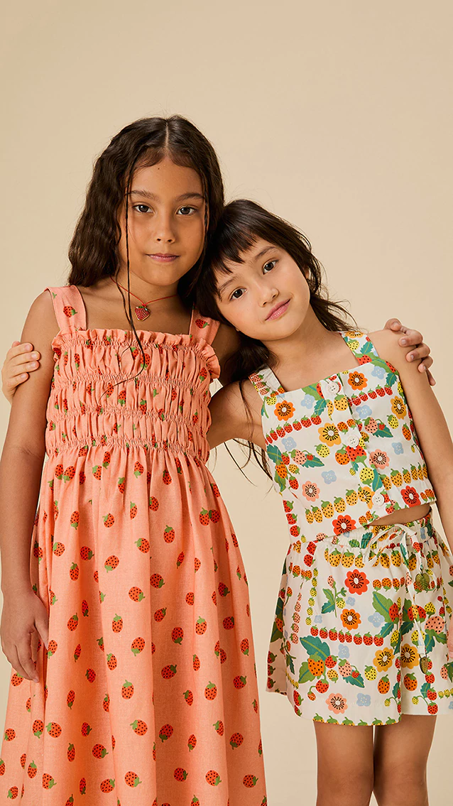 O destaque fica por conta da estampa exclusiva com morangos da coleção Brotinho, que traz um visual alegre e divertido, perfeito para ocasiões especiais ou momentos casuais.
