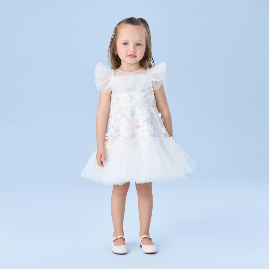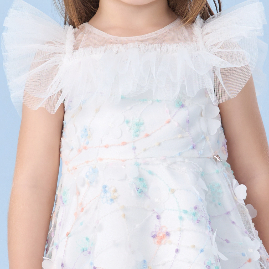 Um vestido com sobreposição de tule todo bordado e aplicação de flores em 3D é a escolha perfeita para sua pequena brilhar. Com um corpo delicado em tule bordado e um encantador babadinho perto da gola, ele combina sofisticação e charme. As mangas e o decote redondo acrescentam um toque especial, enquanto as costas com fechamento de zíper garantem praticidade. A saia rodada, adornada com bordado colorido e babados de tule, completa esse look deslumbrante.