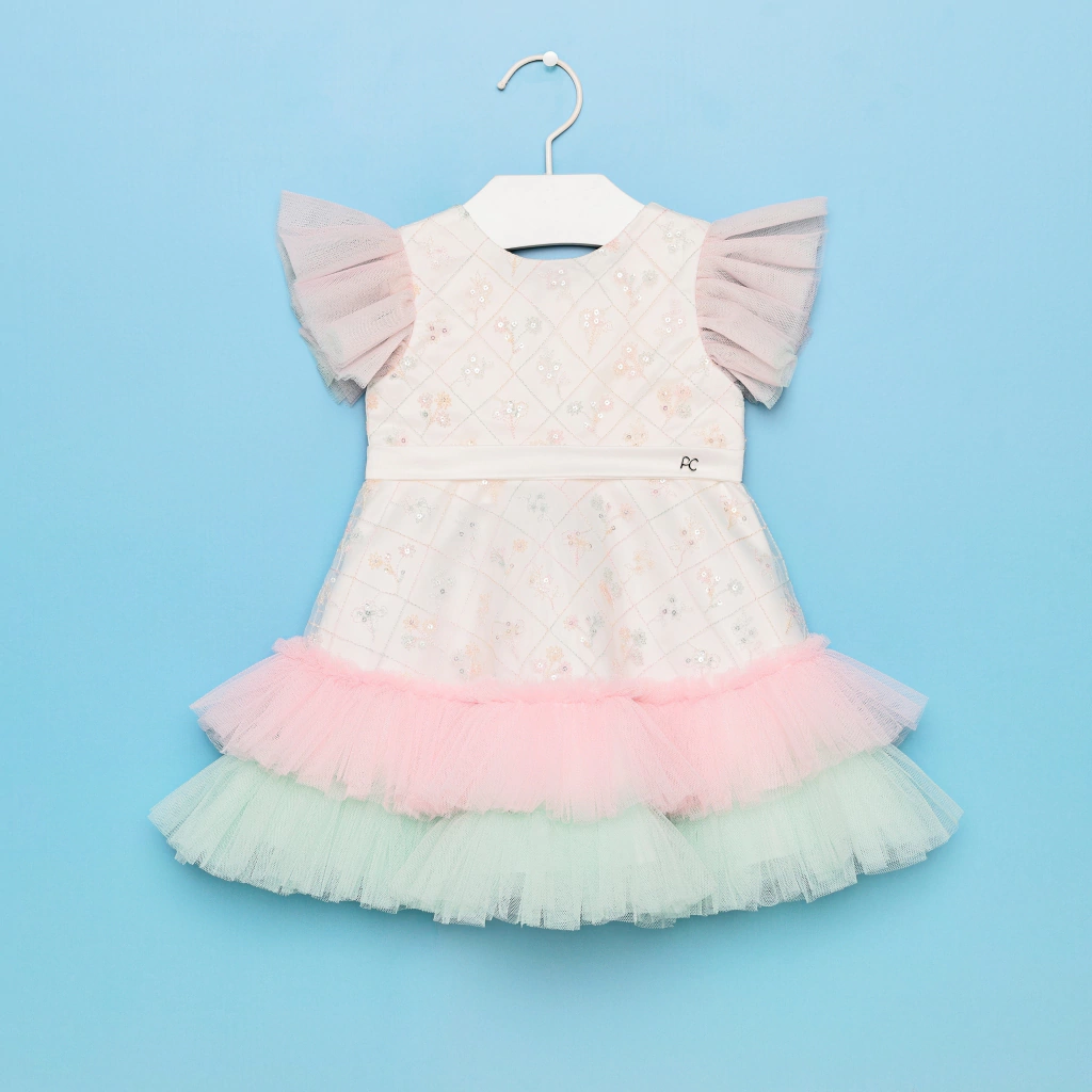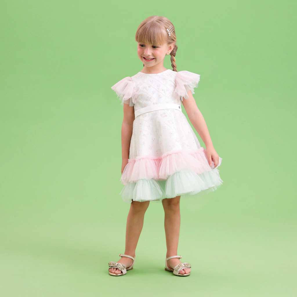 As mangas curtas com babadinho de tule colorido e a gola com decote redondo adicionam charme. A saia apresenta uma linda sobreposição de tule e um barrado de babadinho colorido.