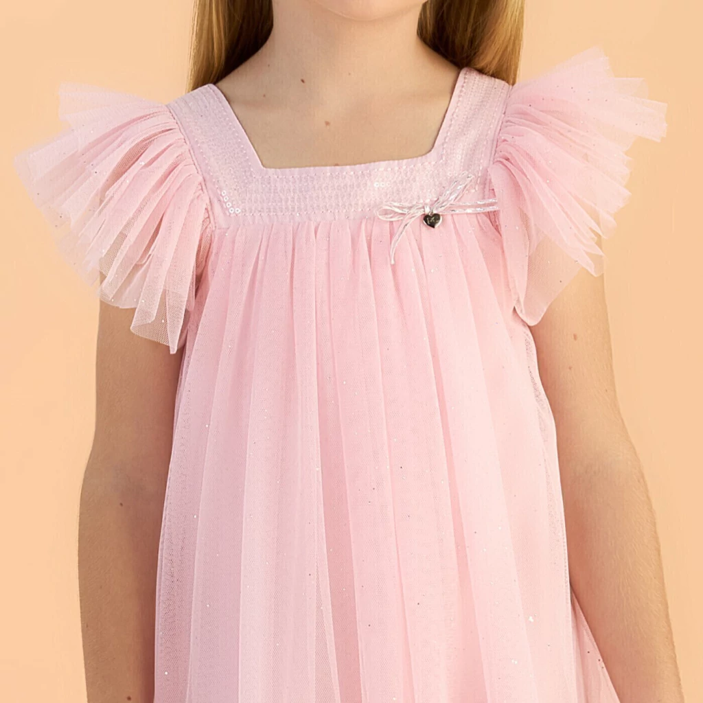 Perfeito para ocasiões especiais, este vestido rosa destaca-se pelo bordado de paetês na gola, que brilha suavemente sob a luz, adicionando um toque de glamour. As alças em babados delicados de tule trazem um charme extra, enquanto a saia volumosa em tule garante conforto e liberdade para as pequenas se divertirem. Ideal para festas, o vestido é uma escolha irresistível para deixar sua menina ainda mais linda!